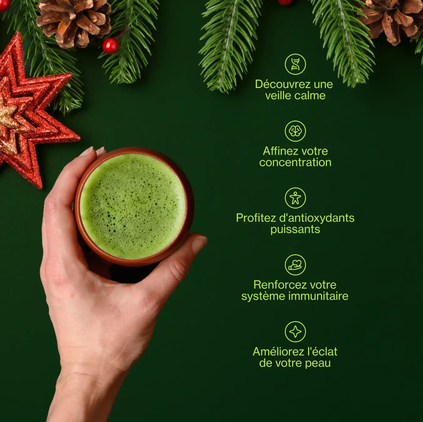 Le matcha regorge de puissants antioxydants, de caféine naturelle et d'acides aminés apaisants qui fournissent une énergie durable, une clarté mentale et un sentiment de calme et de concentration. Il favorise le bien-être général, stimule le métabolisme et renforce le système immunitaire, ce qui en fait le complément idéal à votre routine quotidienne ou à vos rituels de vacances.
