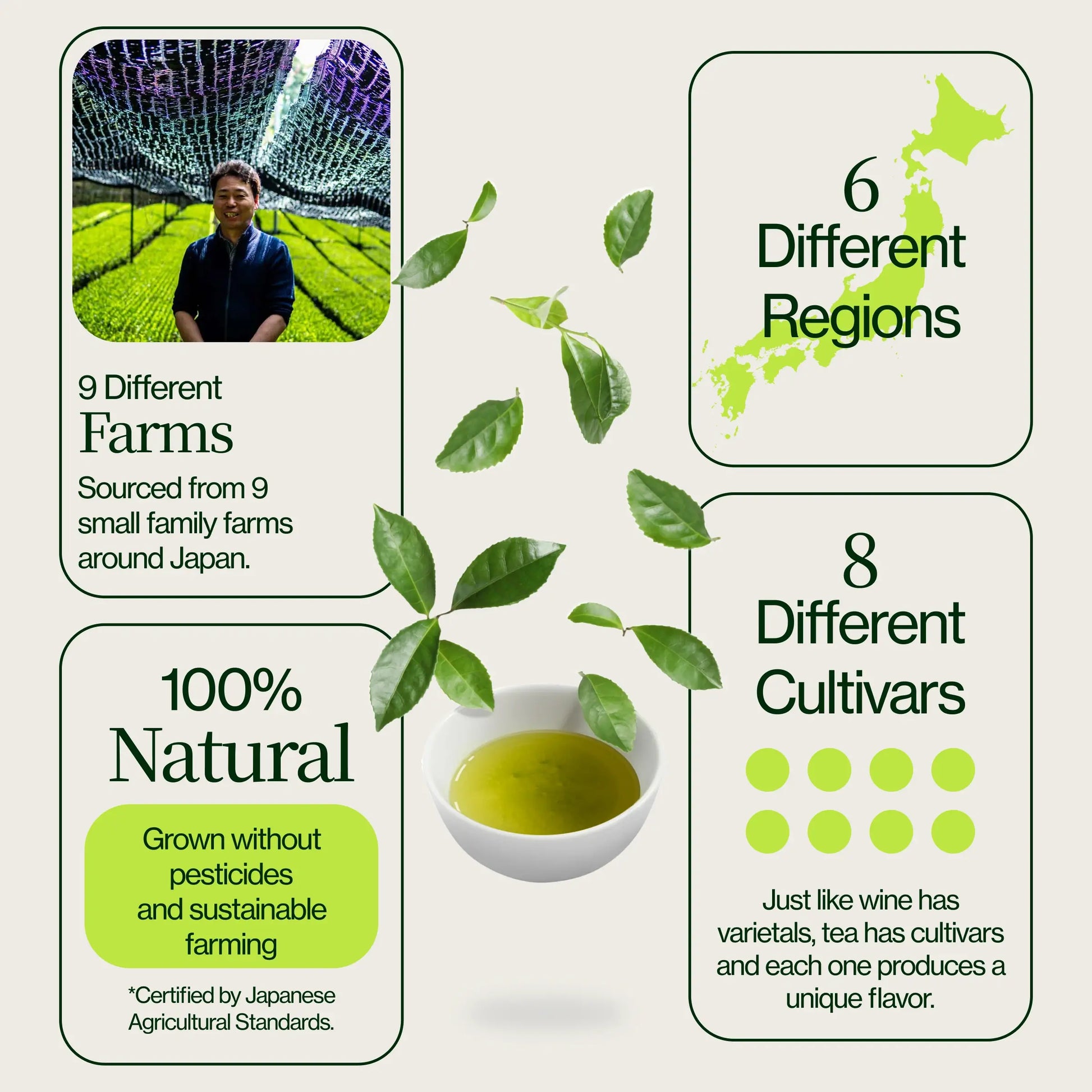 Les thés présentés dans ce calendrier proviennent de six célèbres régions productrices de thé : Miyazaki, Kyoto, Uji, Shizuoka, Kagoshima et Kirishima . Chaque thé est cultivé par de petites fermes familiales, incarnant le savoir-faire, le dévouement et le caractère régional qui définissent le thé japonais.