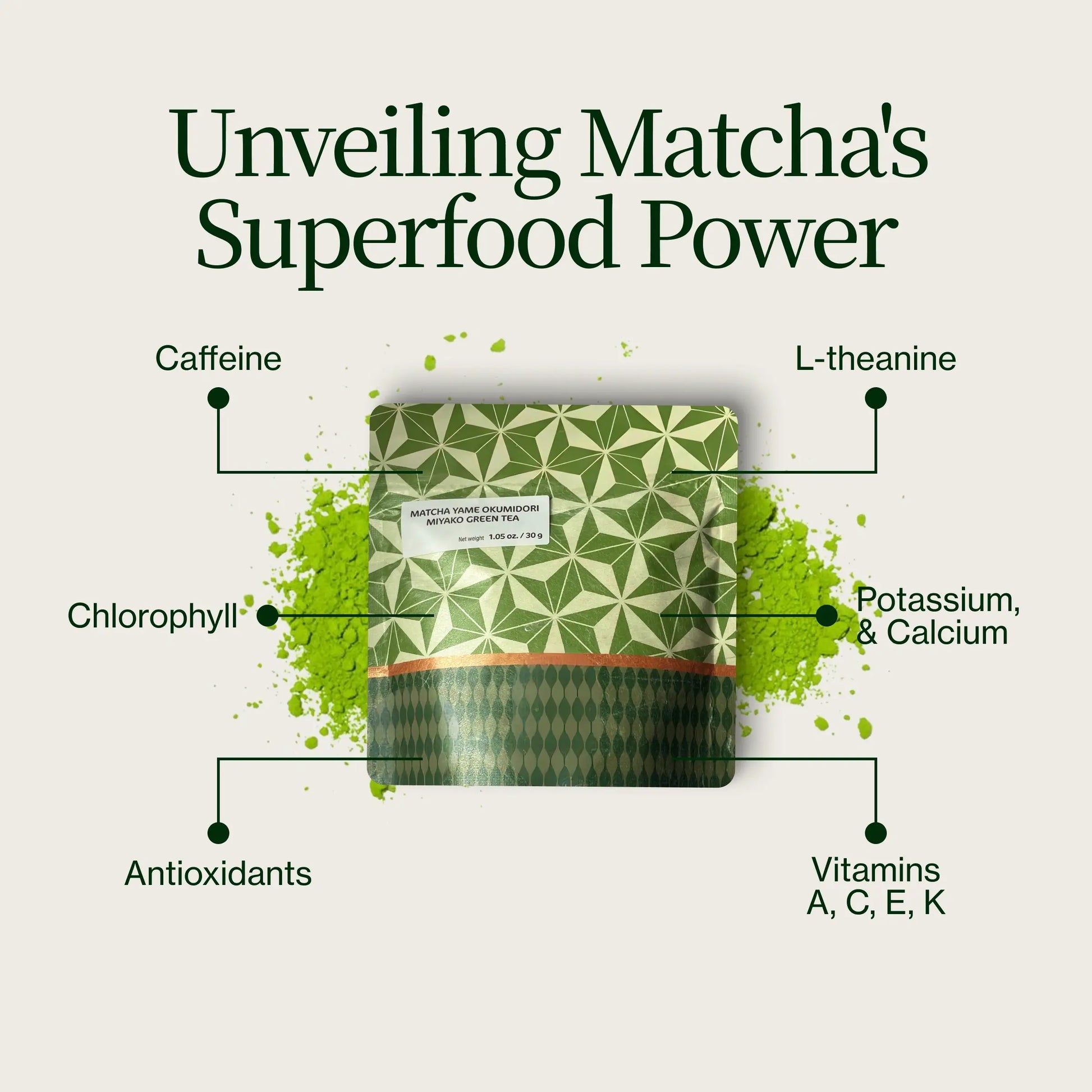 The Matcha Yame Okumidori Miyako is made from the Okumidori cultivar, a Japanese tea variety celebrated for its balanced sweetness, rich umami, and vibrant color.