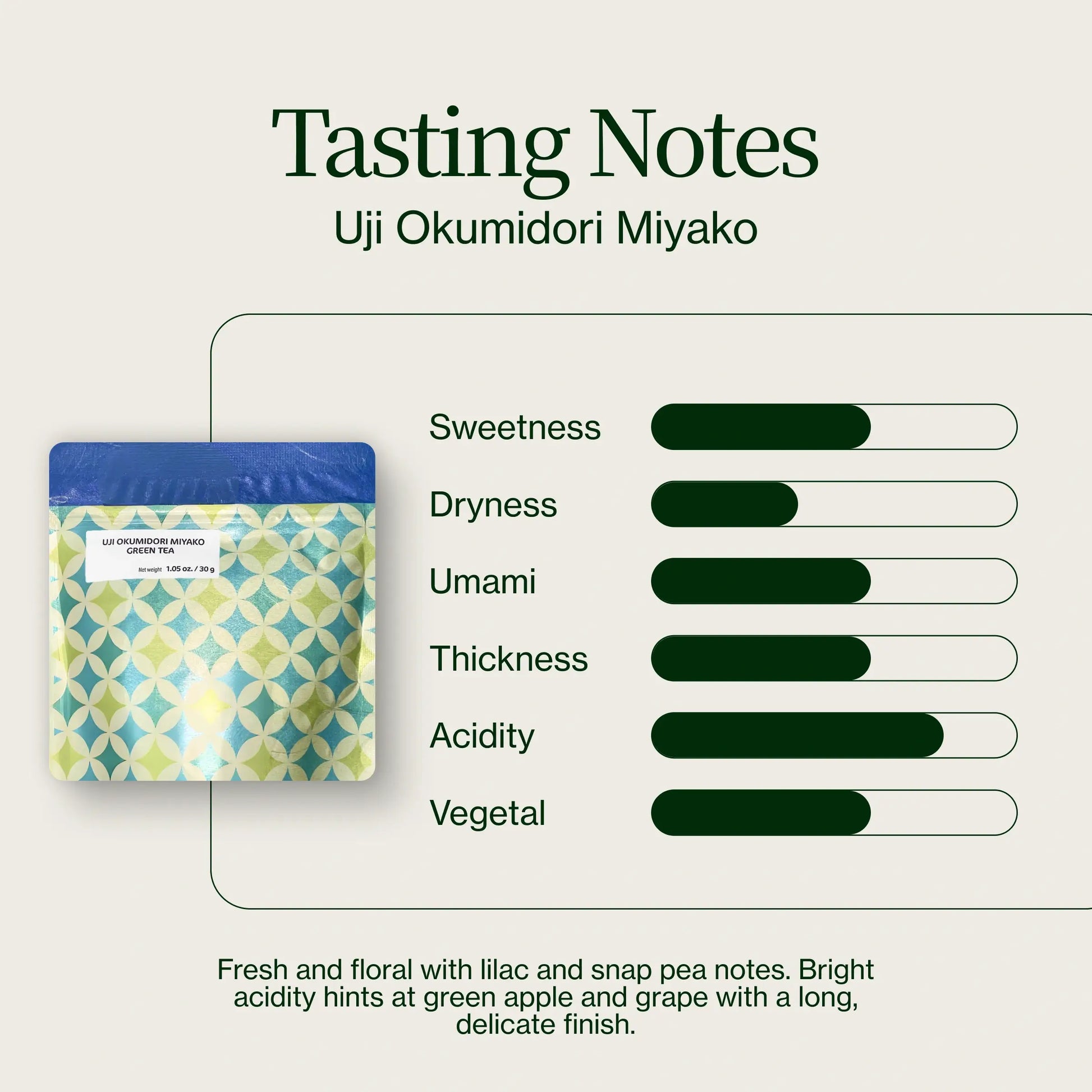 The Matcha Uji Okumidori Miyako is a refreshing and elegant matcha from Uji, Kyoto Prefecture — the birthplace of Japan’s tea culture. Crafted from the Okumidori cultivar, this tea perfectly balances freshness, brightness, and a gentle vegetal sweetness. Its flavor opens with floral notes of lilac and jasmine, deepens into a vibrant green apple-like acidity, and finishes long with a subtle sweetness reminiscent of grape and snap peas.